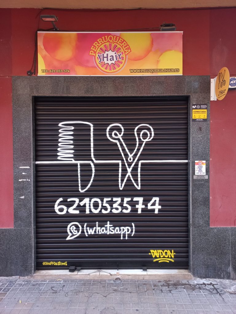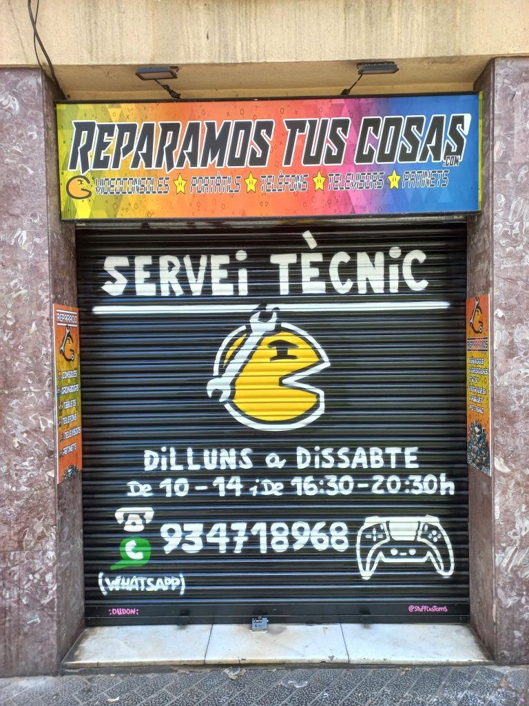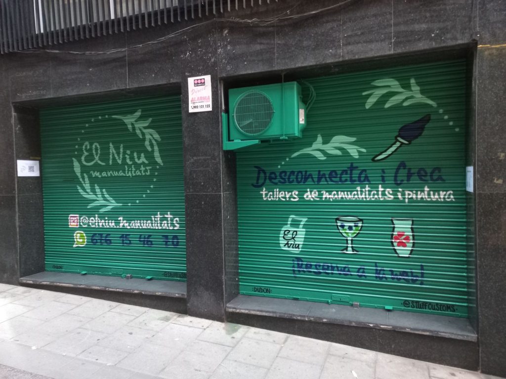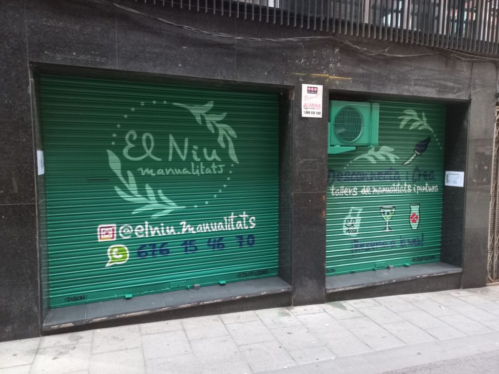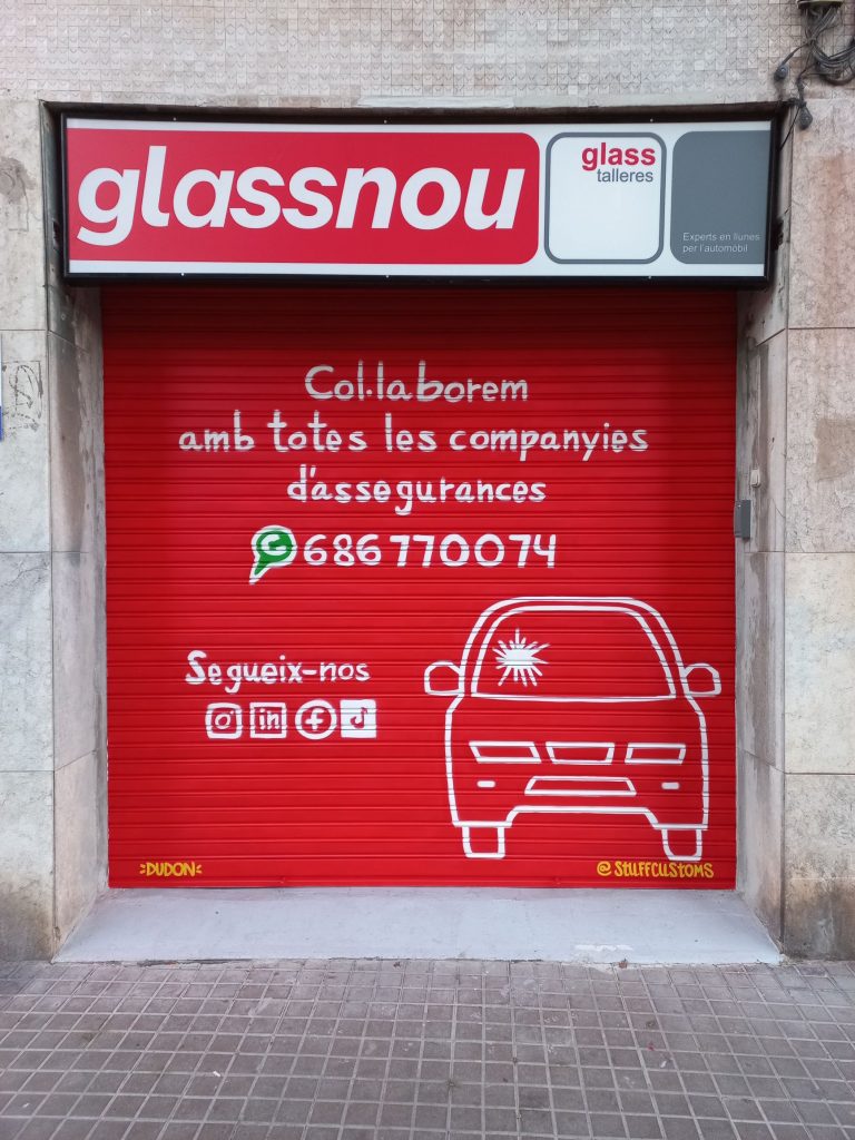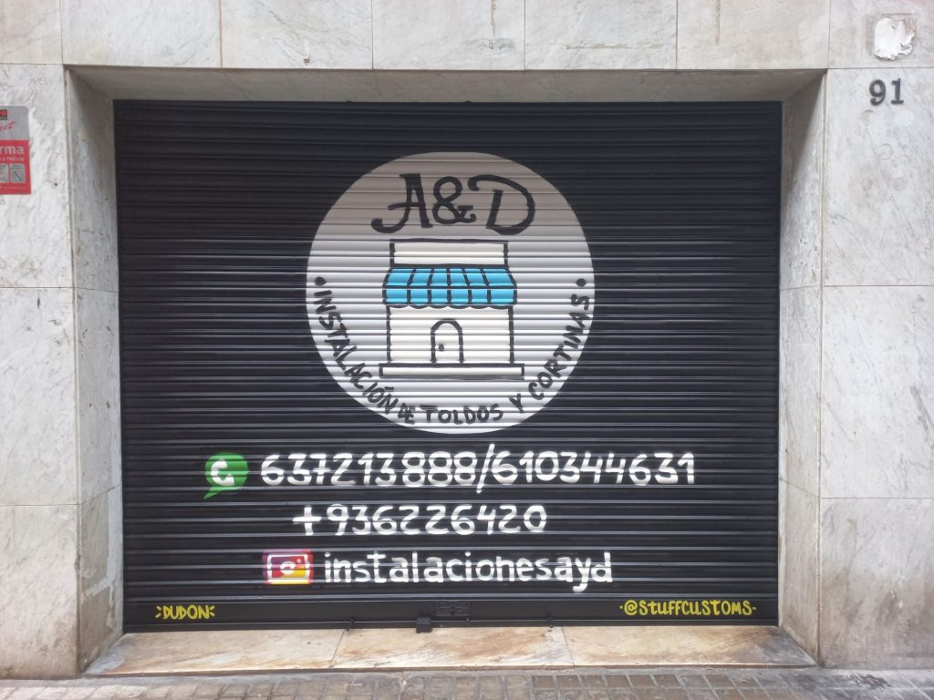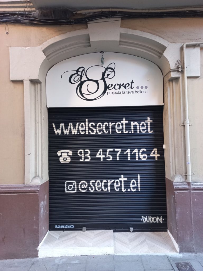 Estos graffitis estilo tarjeta informativa en persianas comerciales han sido realizados en diferentes barrios de Barcelona y alrededores, como Sants, el Clot, Les Corts, l’Eixample y Poble Sec, garantizando resultados limpios, profesionales y visibles para cada negocio.