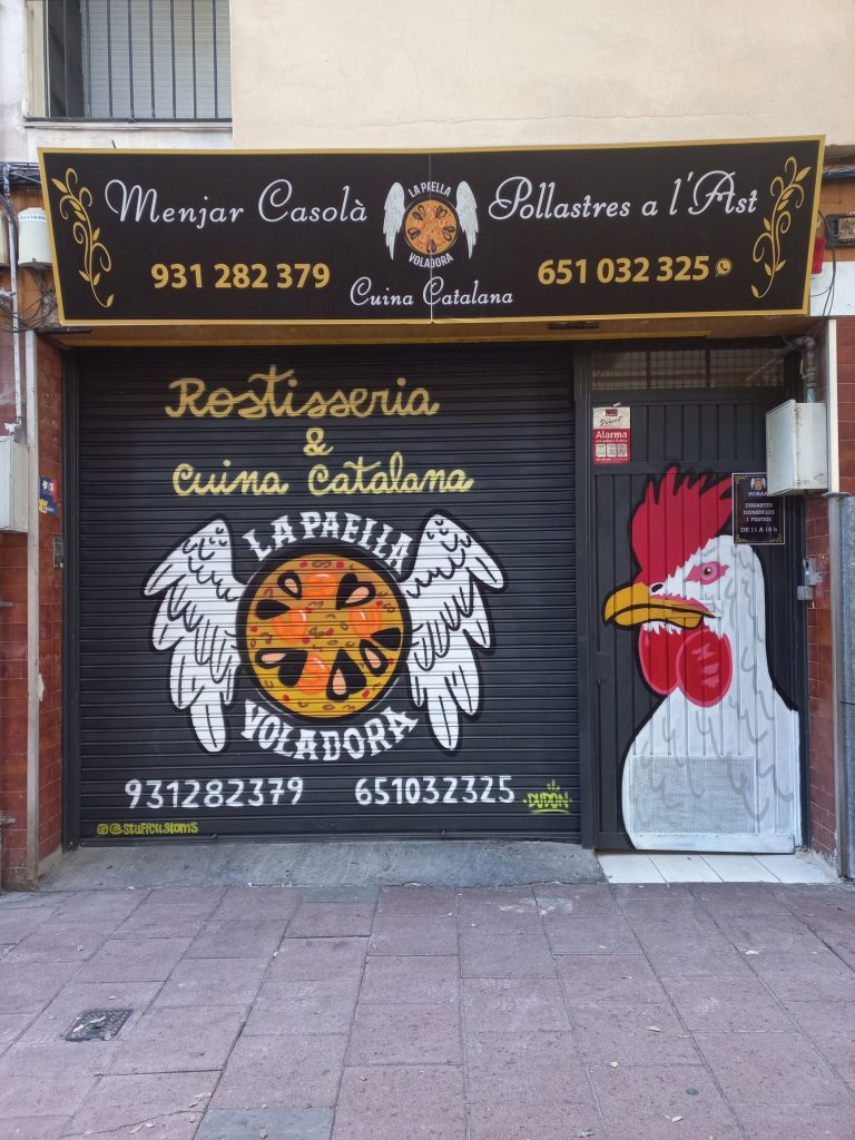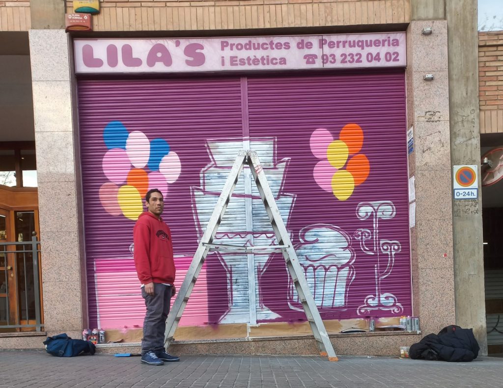• Pintura manual en persiana metálica de gran formato para negocio local en Barcelona, diseño artesanal a medida.
