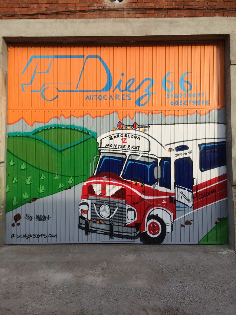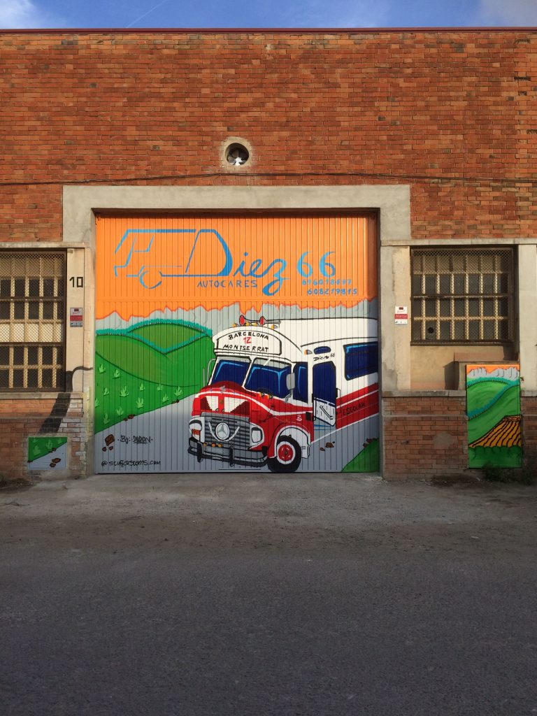 • Graffiti artístico pintado a mano en puerta basculante gigante de nave industrial para empresa de autocares